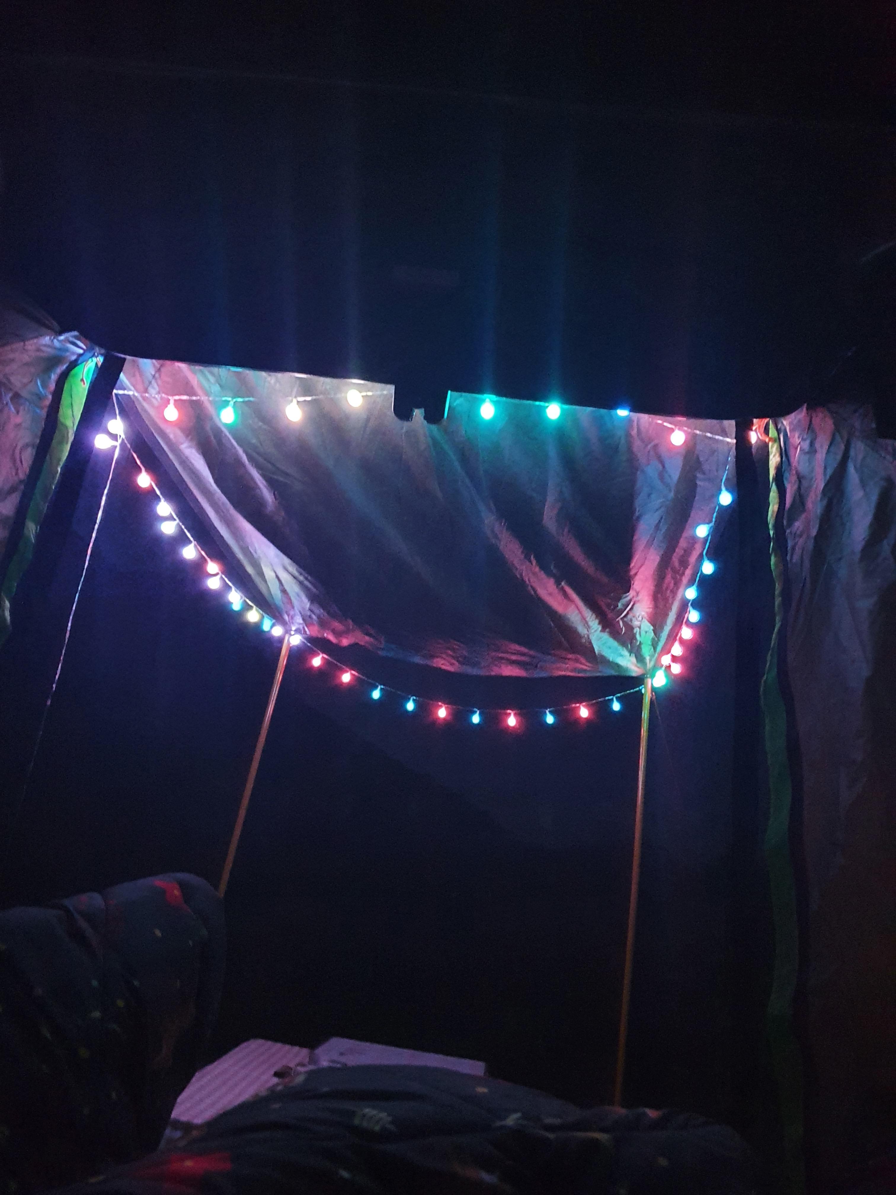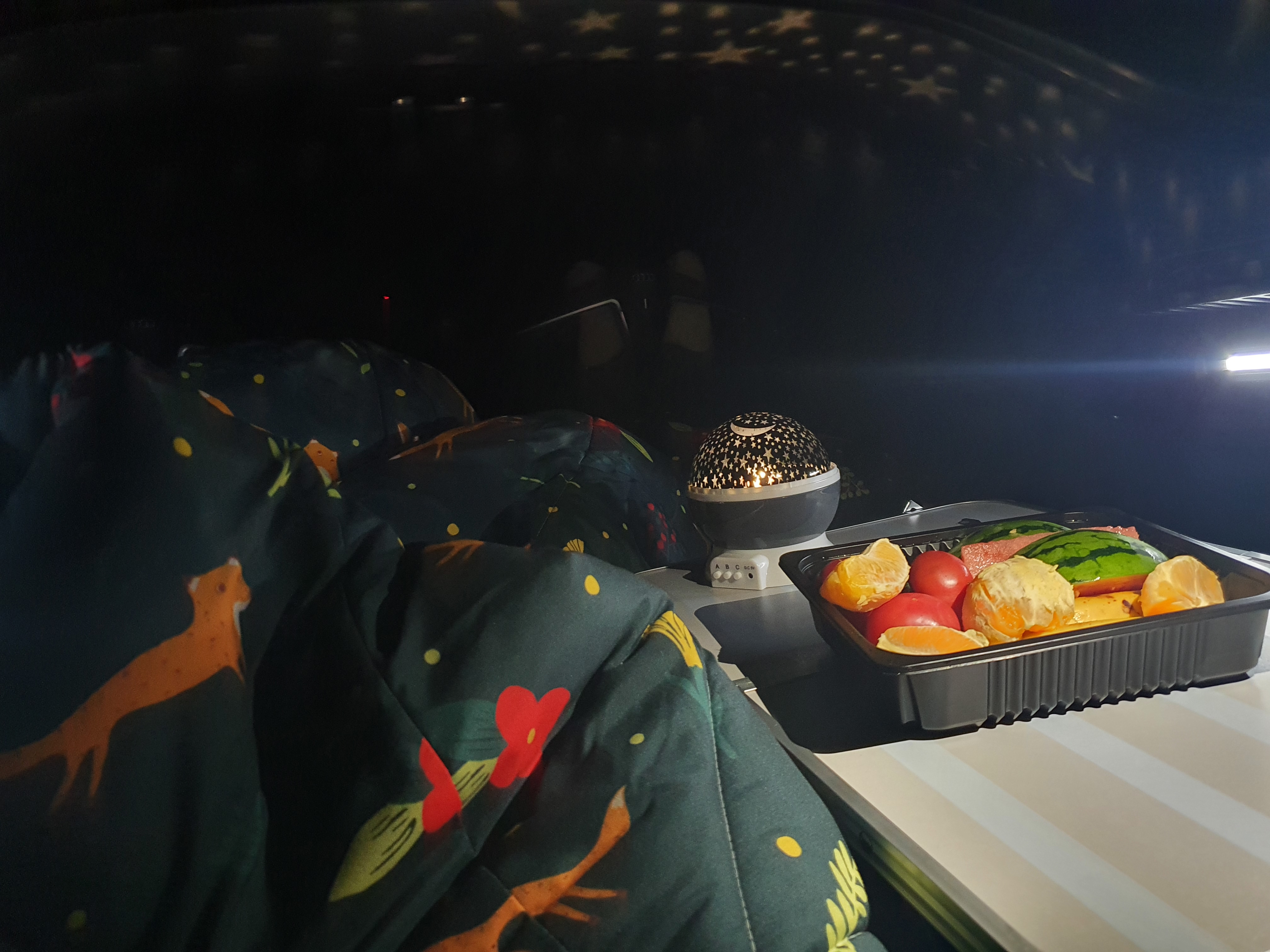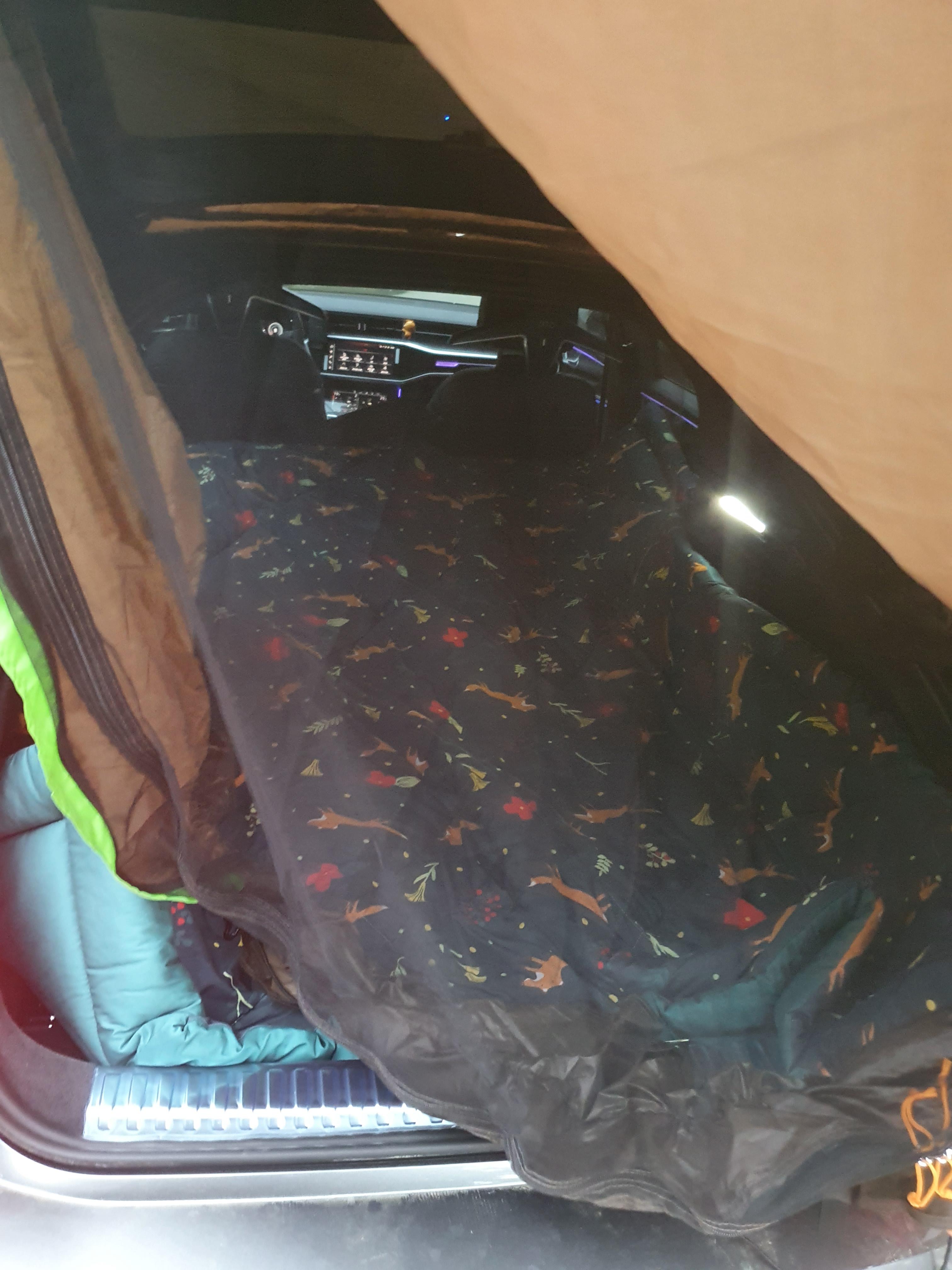 시험적으로 차박텐트를 씌워놓고 이불깔고 누웠더니 딱 2명이 눕기 적당한 공간이었네요~