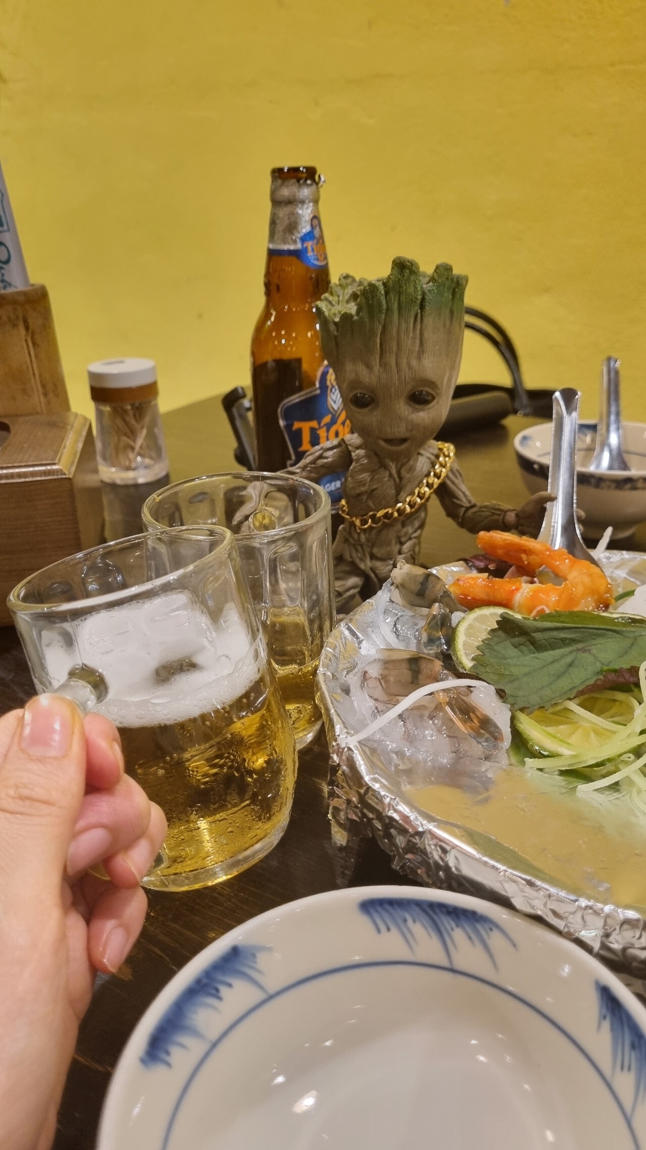 맛조개모닝글로리, 새우회300g, 새우마늘볶음300g, 새우타마린느300g, 청경채볶음, 대합구이950g에 맥주6병해서